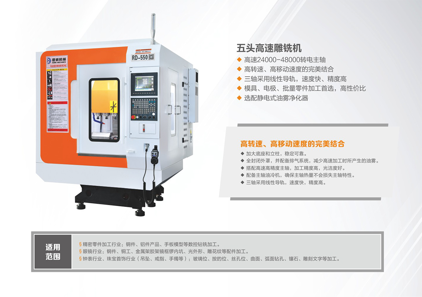 新型環(huán)保數(shù)控CNC -高速雕銑機采用高速24000-48000轉(zhuǎn)電主軸,選配靜電式油霧凈化器,三軸采用線性導(dǎo)軌,速度快,精度高,是模具、電極、批量零件加工;采用臺灣新代或臺灣寶元控制系統(tǒng),日本YASKWA電機及驅(qū)動,臺灣上銀、銀泰導(dǎo)軌及滾珠絲桿,華雕精密主軸,是高轉(zhuǎn)速、高移動速度的結(jié)合。