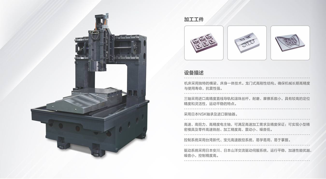 新型環(huán)保數(shù)控CNC -高速雕銑機采用高速24000-48000轉(zhuǎn)電主軸,選配靜電式油霧凈化器,三軸采用線性導(dǎo)軌,速度快,精度高,是模具、電極、批量零件加工;采用臺灣新代或臺灣寶元控制系統(tǒng),日本YASKWA電機及驅(qū)動,臺灣上銀、銀泰導(dǎo)軌及滾珠絲桿,華雕精密主軸,是高轉(zhuǎn)速、高移動速度的結(jié)合。